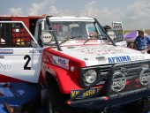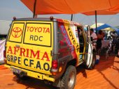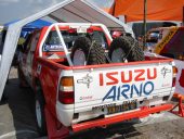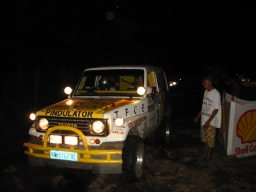 Arrivée des différentes équipes sur le lieu du parc fermé. Chaque équipage s'installe suivant ses affinités, ses goûts et ses couleurs. Le team Bowler-Getragri aligne sa nouvelle acquisition pilotée par le fils de James Bond, alias Jean-Marc VDK. Auvent très sobre dans un style très british, le tout raccordé à un camion rase-moquette d'assistance qui a eu le plus grand mal à rejoindre les lieux. Les Argazzi-Brothers ont quant à eux récupéré le pick-up Toyota de Dark Vador dans la guerre des étoiles. Ne désirant pas être importunité par l'odeur de thé émanant de la nouvelle voiture Anglaise, ils se sont installés à l'autre bout du campement. Le team Arno , Sponsor officiel de l'épreuve, est là en force, dans une ambiance très Otour de France cycliste avec petits drapeaux, jus de fruits et zakouski. Patrick Huyghe est comme à l'accoutumée très sobre et organisé, tandis que son copi, Marco Pantani et sa charmante épouse font le public relation dans le parc presse. Le pick-up Isuzu est bichonné, arborant fièrement un tout nouveau pont avant, bien utile sur ce genre d'épreuve Pindulator de Gillet/Bernimolin est bien décidé à aveugler tout le monde. Pour ce faire, ils ont déployé un gigantesque spinaker orange récupéré sur un voilier de la route du rhum. La voile fait à la fois office de parasol, générateur d'électricité statique et climatisation. Le tout dans un joyeux claquement dû à la bonne brise soufflant de nord-est. Fermez les yeux, vous êtes à la mer du Nord! La Toyota FZJ 70 à moteur 6 cylindres 4500 CC soutenue par l'importateur Afrima n'a pas connu de grosse évolutions pendant l'intersaison, mais l'équipage mise avant tout sur la fiabilité légendaire de la voiture. A côté de lui, s'est installé Il Padrino, son altesse sérénissime Pierre Cagnetti et son grand chambellan Ludo Ketai, en tête au classement du nombre de sponsors affichés. Le principal est là, la voiture est complète et pour une fois prête à temps, le moteur imite le bruit d'un pousseur de l'Onatra , le pilote et son copi sont frais et dispos et tous les parasols ont été oubliés... Qu'à cela ne tienne, les dames sont ravies car le soleil est là et le bronzage s'affirme de minutes en minutes. Faites quelques mètres et bienvenue au royaume du diesel turbo. ZAF est là, mais avec son petit moteur, car le gros turbo s'est fait la malle pendant la semaine emportant avec lui une bonne partie des capacités de refroidissement du groupe propulseur. Qu'à cela tienne, l'essentiel est de participer et Zaf est là dans la bonne humeur pour nous le rappeler. A coté de lui, Rosenberg étrenne fièrement son HJ 61 fraîchement repeint et remotorisé. Le Ricky Carmicaël du plateau, fort de ses nouveaux chevaux de feu dopés à la caféine entend bien marquer cette course de son empreinte. Nous verrons plus loin qu'il sera effectivement question d'empreinte, mais pas nécessairement de celle voulue... Quelques mètres encore, et voici le team Safricas, qui n'a rien à envier au team Mitsubishi du Dakar quant il s'agit d'organisation. 2 voitures superbement préparées, groupe électro qui distille une douce mélodie, container de survie, douche généreusement offerte à d'autres concurrents, la logistique et la sportivité sont au rendez-vous. Yseboot-Letertre alignent le Patrol turbo essence qui avait défrayé la chronique aux boucles de Kin 2002 et dont tout le monde espère qu'elle a réglé ses problèmes de jeunesse pour enfin montrer ce qu'elle a réellement dans le ventre. A coté d'eux, Simon-Bergiers dont c'est la première course, sont chauds comme des baraques à frites et veulent en découdre avec la terre entière. Ils alignent un Toyota LJ 70 dans lequel a été greffé un V6 3.0L de Mitsubishi Pajero. Les Cow-boys de Western Union sont bien la eux aussi, décidés à terminer leur première course. DeKijver-George peaufinent donc leur LJ70 à moteur Celica sous l'oeil vif et clairvoyant du préparateur/team manager Christian Broze; Watouwila /Nsimba, le sympathique équipage congolais sur Range Rover, réalise déjà un exploit en ralliant sans encombre le parc fermé. Engagé de dernière minute, Pierrot Lejeune cherche désespérément une copilote pour l'accompagner dans l'aventure sur les pistes techniques du circuit. L'Isuzu V6 a reçu pour l'occasion une nouvelle suspension renforcée, dérivée de celle montée sur le véhicule pour tracter les caravanes. C'est d'ailleurs probablement ce qui effraie la majorité des dames contactées pour le naviguer, car personne ne trouve de trace de la dite caravane, et on craint qu'il ne l'ait dissimulée et camouflée sur le circuit la nuit précédente pour pouvoir à loisir simuler une panne pendant la course. Beaucoup de beau monde donc, et un absent de taille, Marco Deletaille, qui a préféré réaliser un tonneau avec sa Range à l'entraînement quelques jours avant la course. Plus de peur que de mal, mais il suivra la course depuis son lit..... Jour J - 14H00 - Marais de nganda Yala